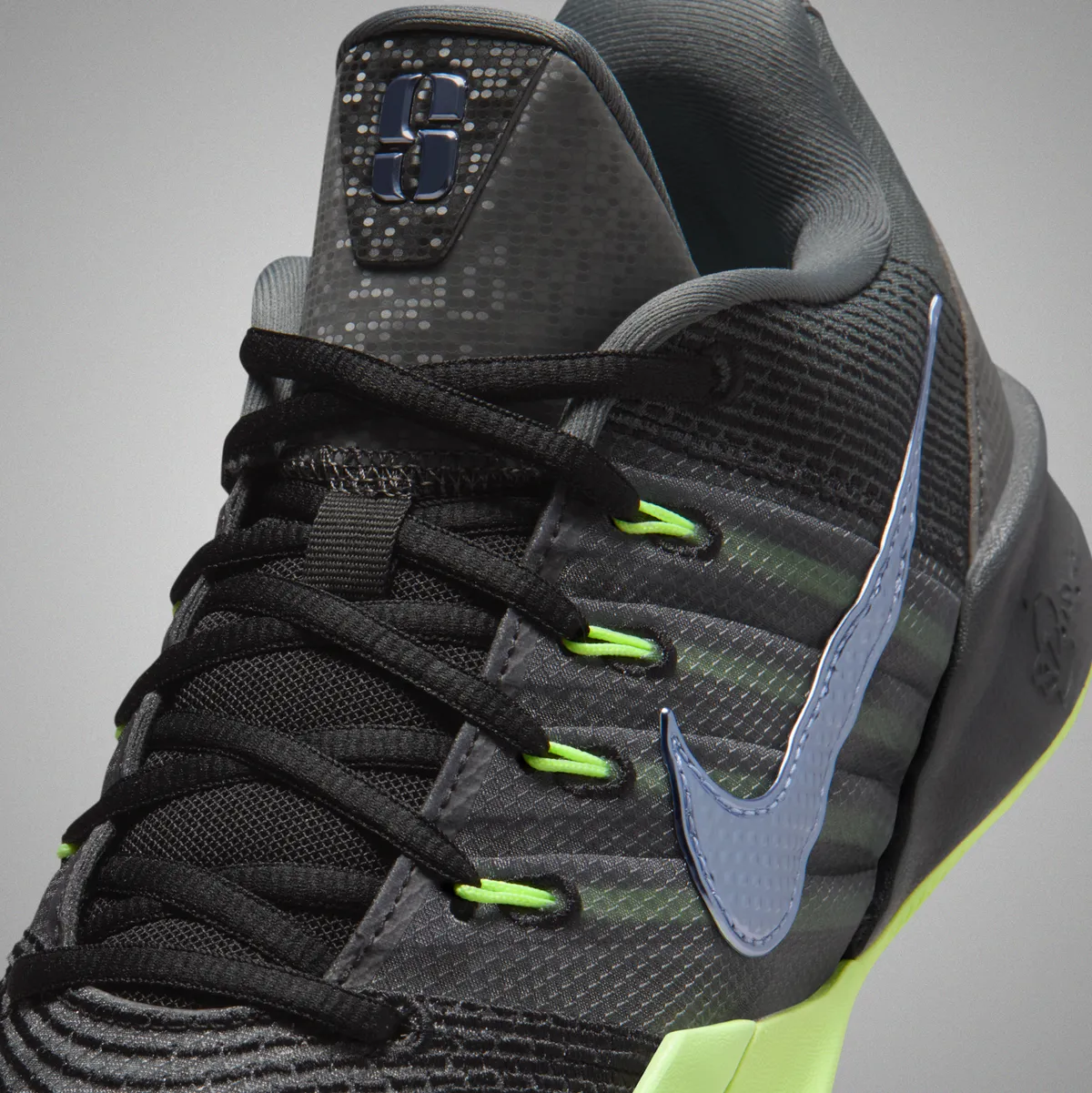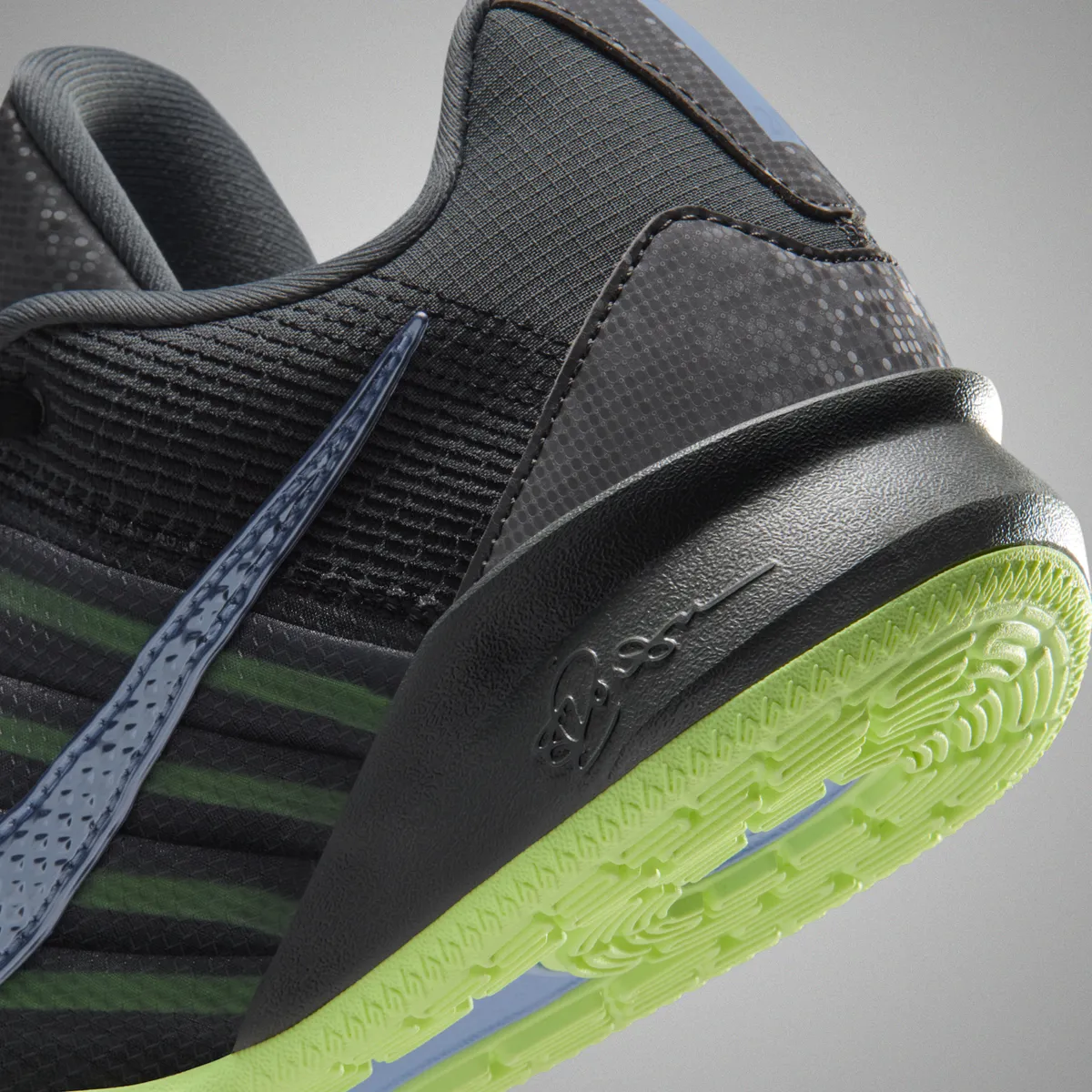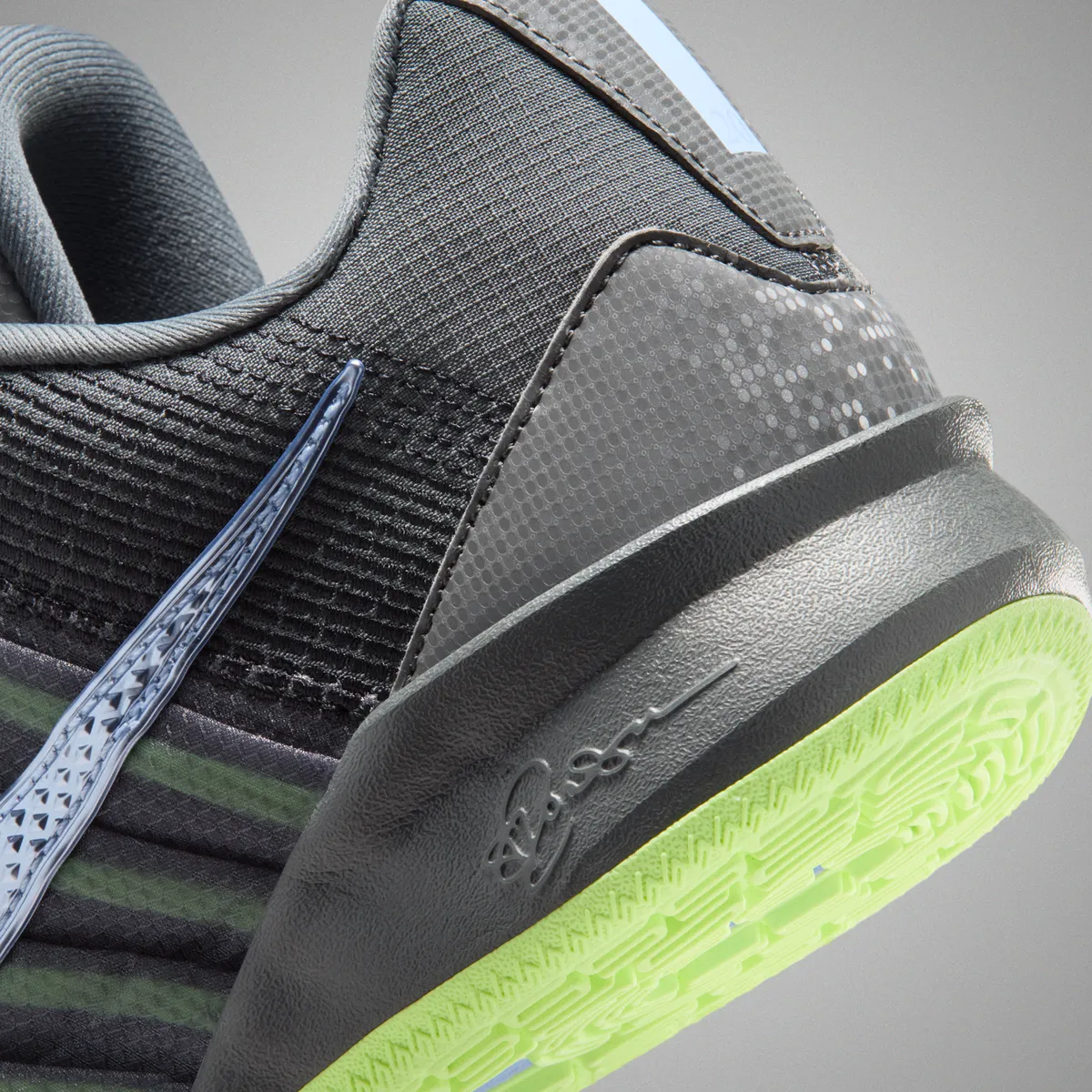 デザイン面ではアイアングレーをベースにしたアッパーが全体に洗練された印象を与えます。この灰色に近い落ち着いた色調はスニーカー全体に調和をもたらしつつ素材感を際立たせます。側面を彩るベアリーボルトの鮮やかなネオングリーンは視覚的なアクセントとなりシューズ全体に躍動感をプラスします。さらにミントフォームの柔らかな明るさがトーンの中にさりげなく溶け込みアイテム全体に絶妙なバランスをもたらしています。一方でアルミニウムの近未来的なメタリック感がスウッシュロゴに採用されており各部のディテールを引き締めています。