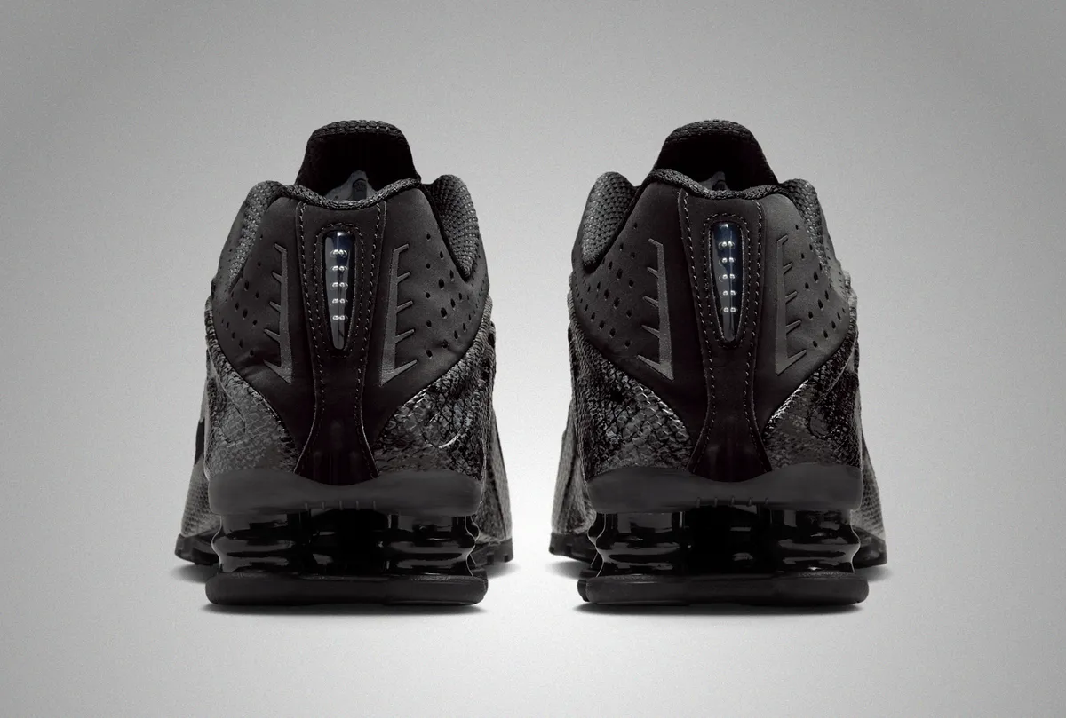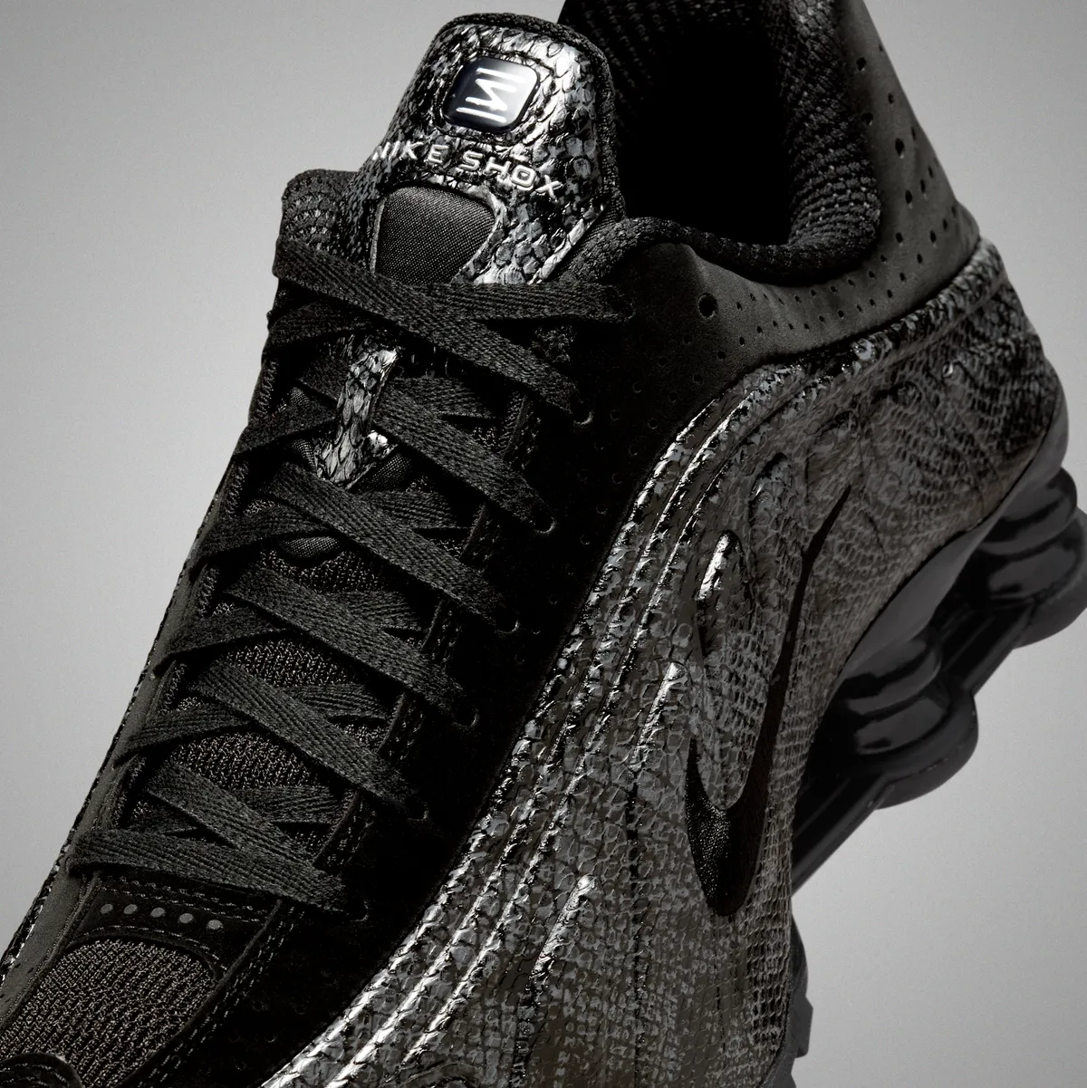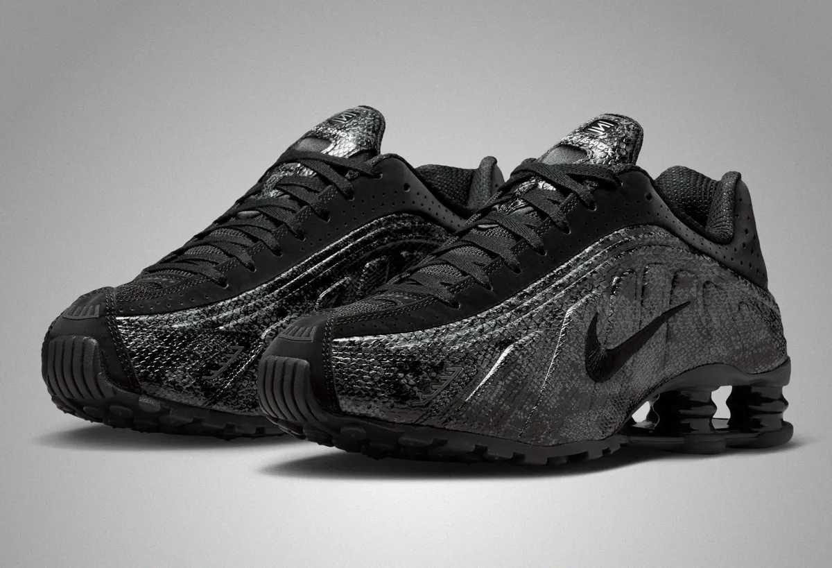 ナイキ ショックス R4 ブラック スネークスキンは全体を覆うダークトーンのレイヤー構成が強い緊張感を生み出す一足です。