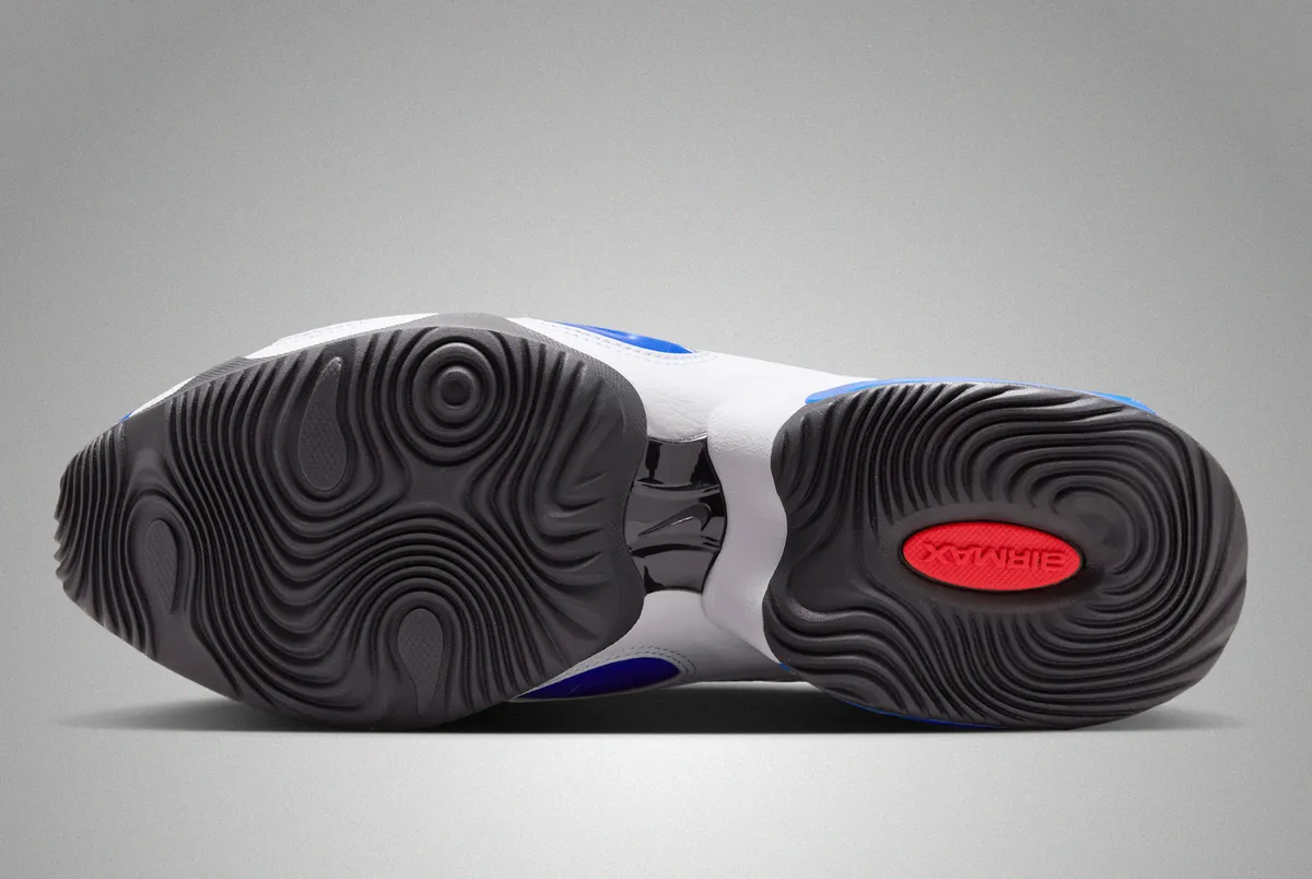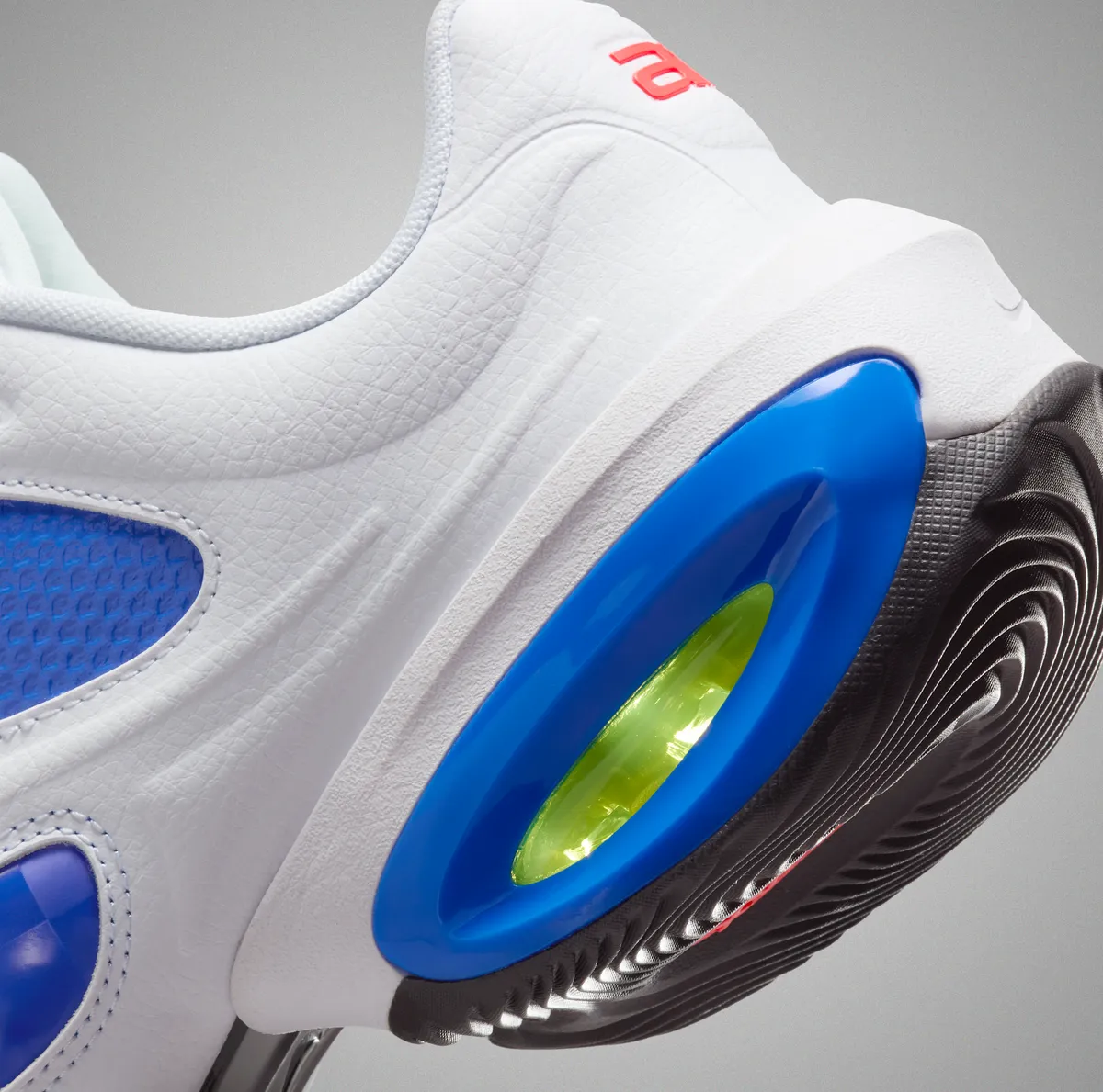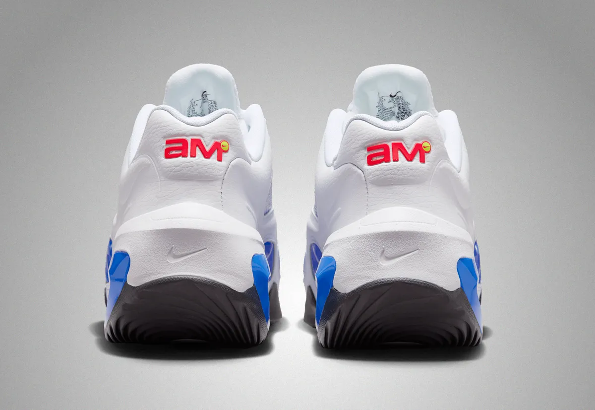 ミッドソールに並ぶ楕円形のエアユニットにはライムグリーンが沈み込み透明層の内側に潜む構造が立体的に映ります。アウトソールのブラックは凹凸の深いパターンが重なりブルーのパーツとの対比によって動きの余韻を宿します。シュータンに置かれた「AMM」の文字は赤の鮮やかさがホワイトの生地から際立ちアクセントとして柔らかく視線を導きます。横方向へ流れるようなシルエットはレトロなランニングシューズの要素を残しつつ現代的なボリューム感を湛えています。