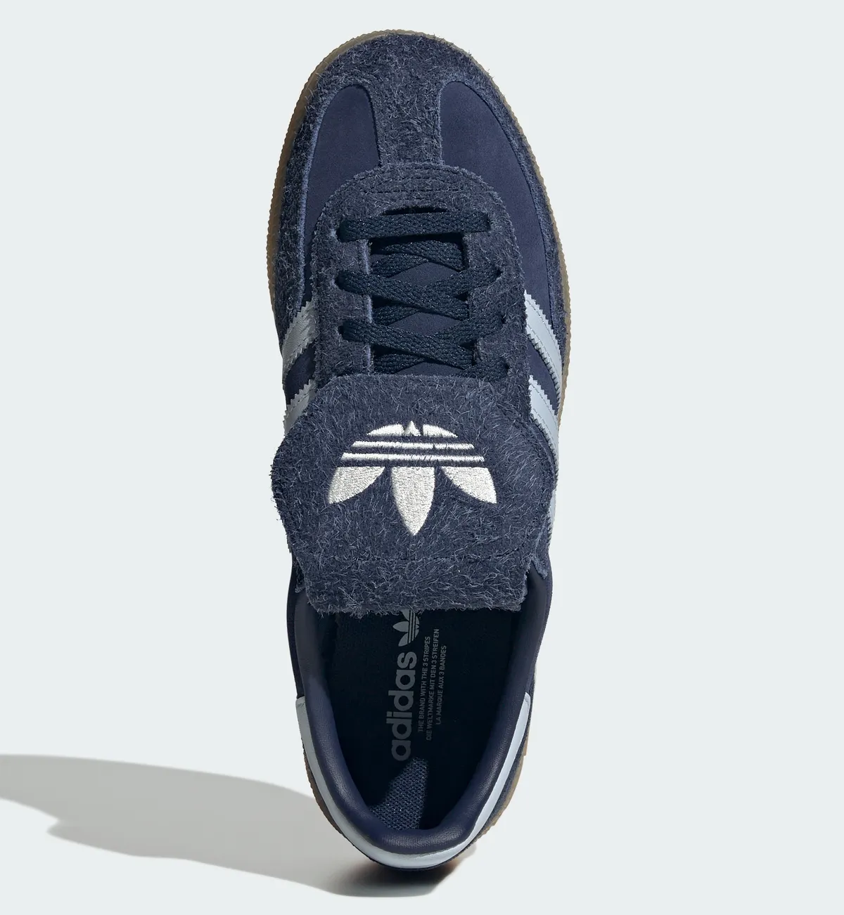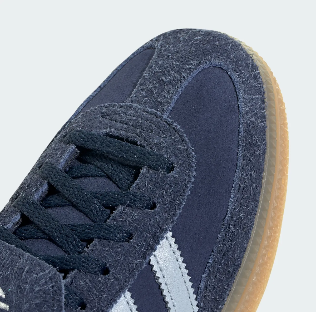 サイドを彩るスリーストライプスにはクリスタルスカイと名付けられた淡いブルーが配されています。この色はダークブルーのベースに対してまるで雲ひとつない冬の空のような清涼感を添えており全体の色彩バランスを軽やかに整えています。ストライプの縁に沿って施された精密なステッチは製品としての堅牢さと丁寧な仕事ぶりを物語っており視覚的なアクセントとして機能しています。そして本モデルの象徴とも言えるのが自由に取り外しができるタンレースカバーです。アッパーと同じダークブルーのスエードで作られたこのカバーは足元に大胆なボリューム感を与え標準的なスニーカーとは一線を画す個性的な佇まいを演出します。カバー中央の白いロゴ刺繍がコントラストを強め全体のデザインを引き締めています。