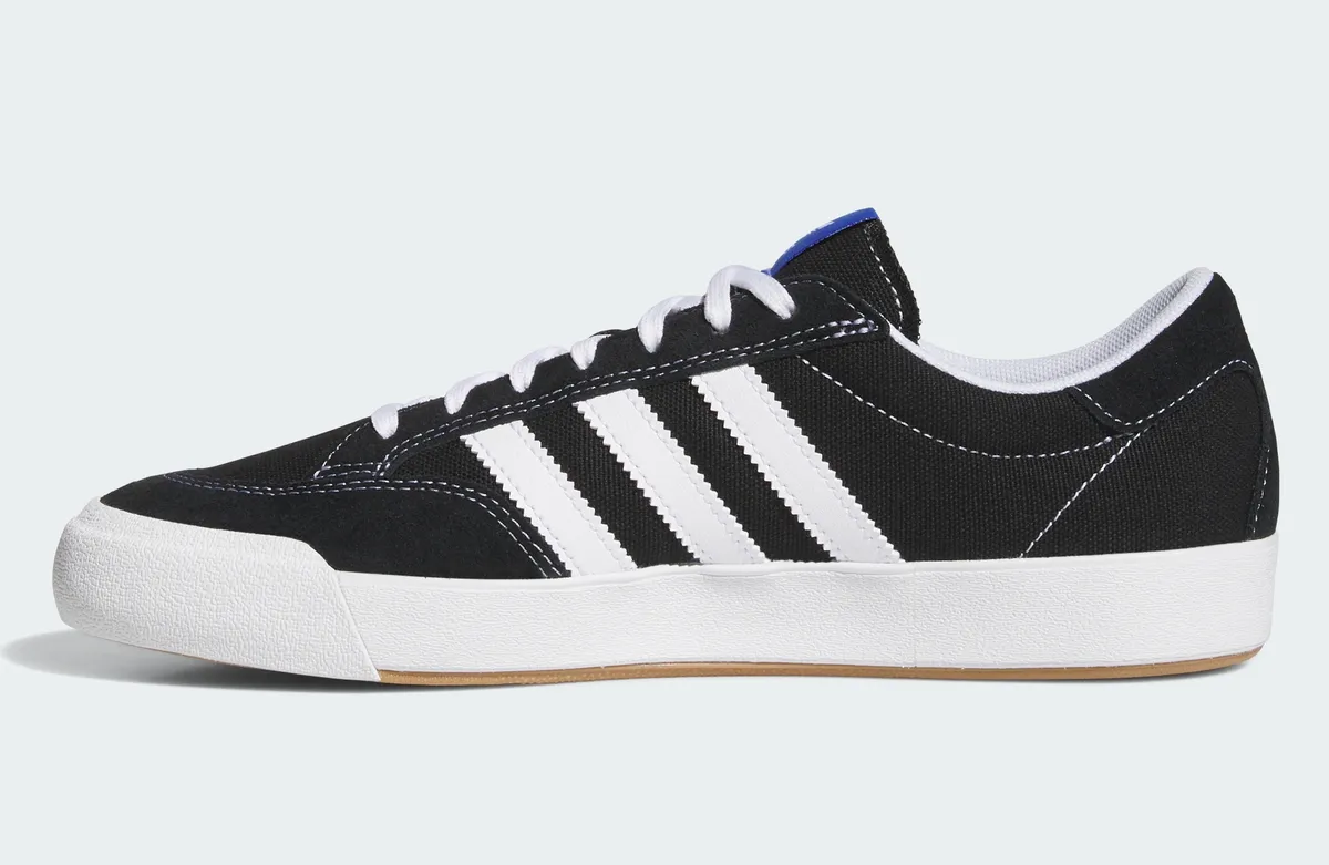 アディダス オリジナルス ノラはスケートボーディングの躍動感とクラシックな美学を融合させた一足です。このモデルはコアブラッククラウドホワイトそしてブルーバードという3つの色調を巧みに組み合わせ視覚的なコントラストを鮮明に描き出しています。