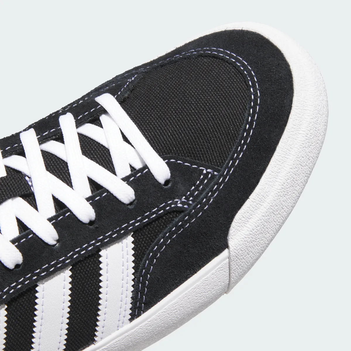アッパーの大部分を占めるコアブラックの素材はしっとりとした質感を備えたレザーと軽やかなテキスタイルを組み合わせて構築されています。つま先から側面にかけて広がる黒の領域は落ち着いた深みを持ちながらも周囲の光を優しく吸収し重厚な佇まいを見せています。そこにアディダスの象徴である3本線がクラウドホワイトの鮮烈な白さで刻まれており黒い背景の中で鋭いラインが浮き上がります。この白は単なる色味ではなく清潔感とスポーティーな勢いをデザインに与えています。