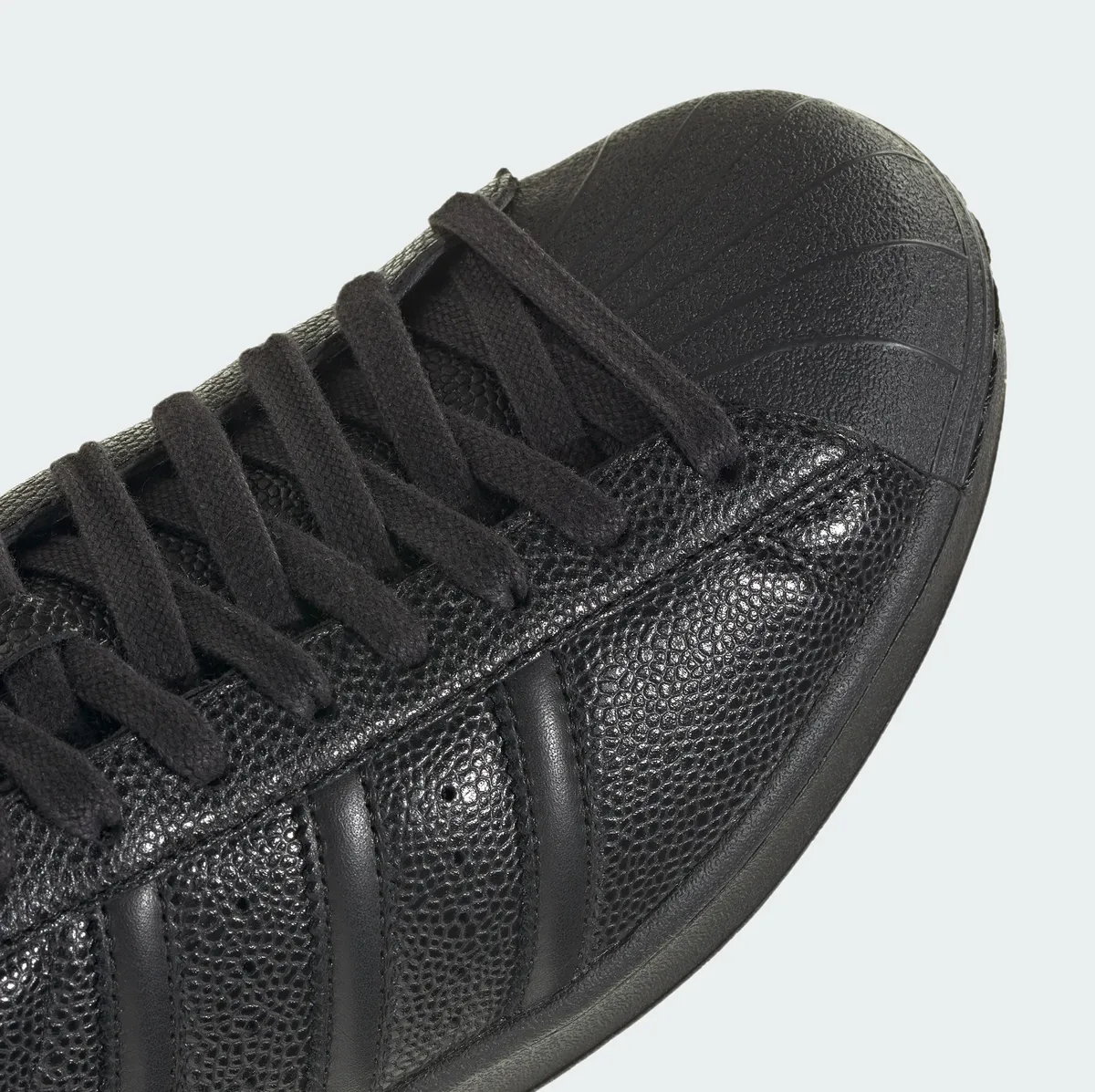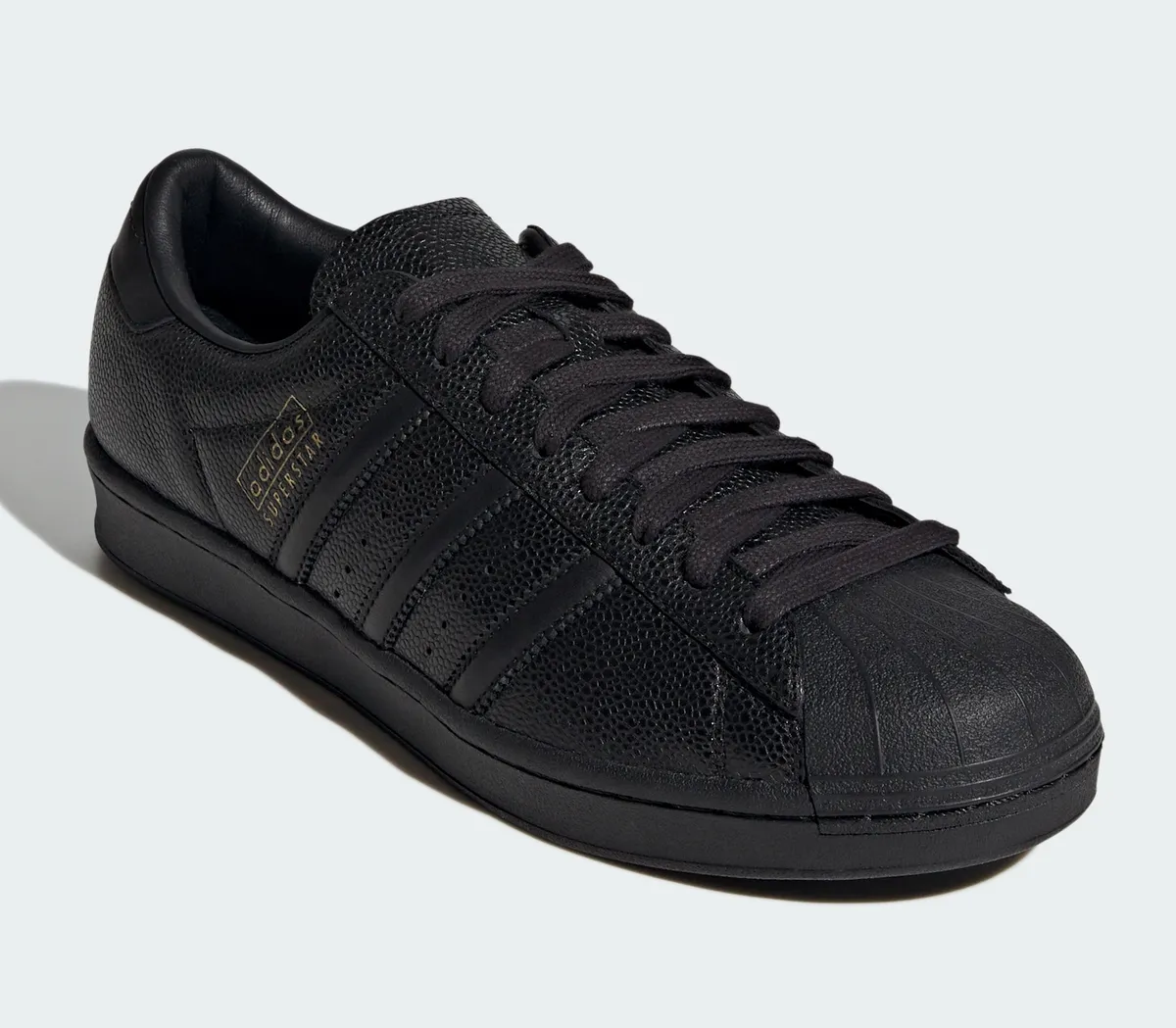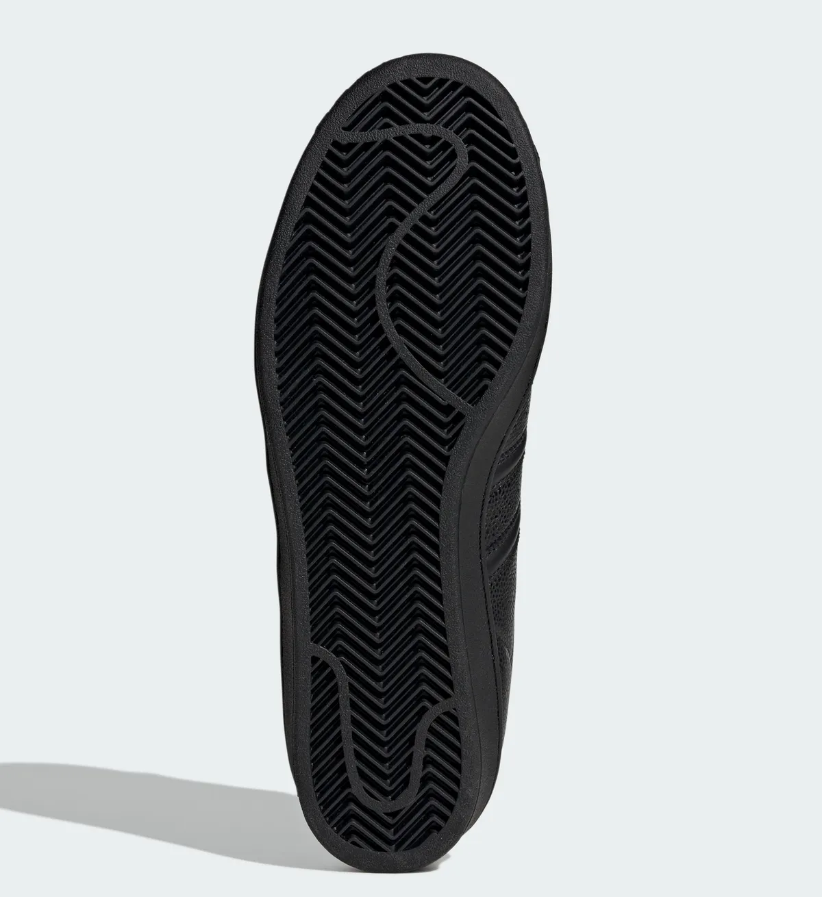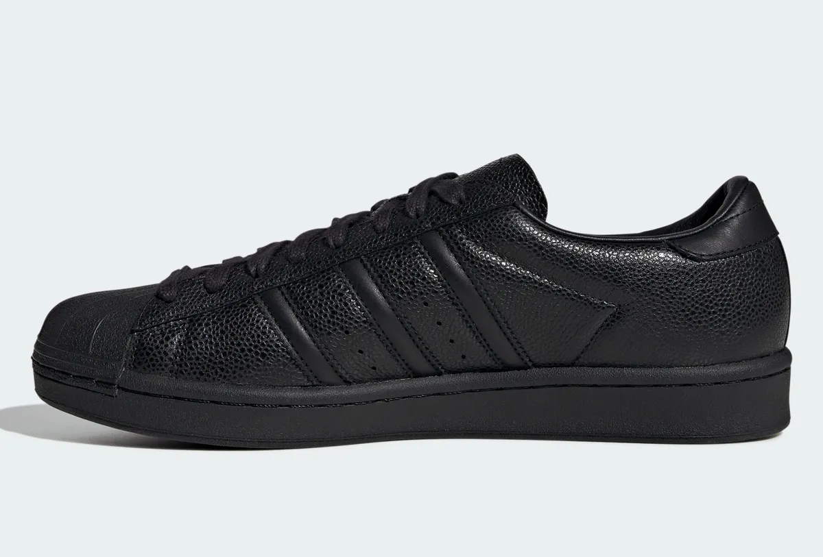 側面に配置されたスリーストライプスも同系色の素材で表現することで主張を抑えつつ縫い目の陰影によってその存在感を静かに示しています。側面の中ほどにはアディダス スーパースターの文字が金色の刻印で刻まれており黒一色の世界に華やかな色彩を添えています。履き口の裏側にまでレザーライニングを施すことで足を入れた瞬間の包み込まれるような心地よさと脱いだ際に見える内部の贅沢な作りを両立させました。靴底のラバーソールも黒で統一されヘリンボーン柄の溝が地面をしっかりと捉える構造です。全体のシルエットは無駄を削ぎ落としたシャープなラインを描き足元をスマートに演出します。