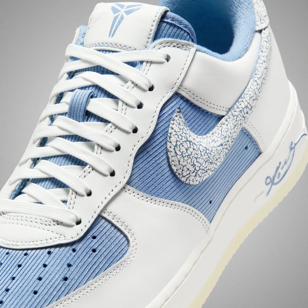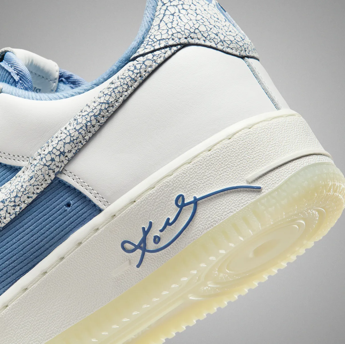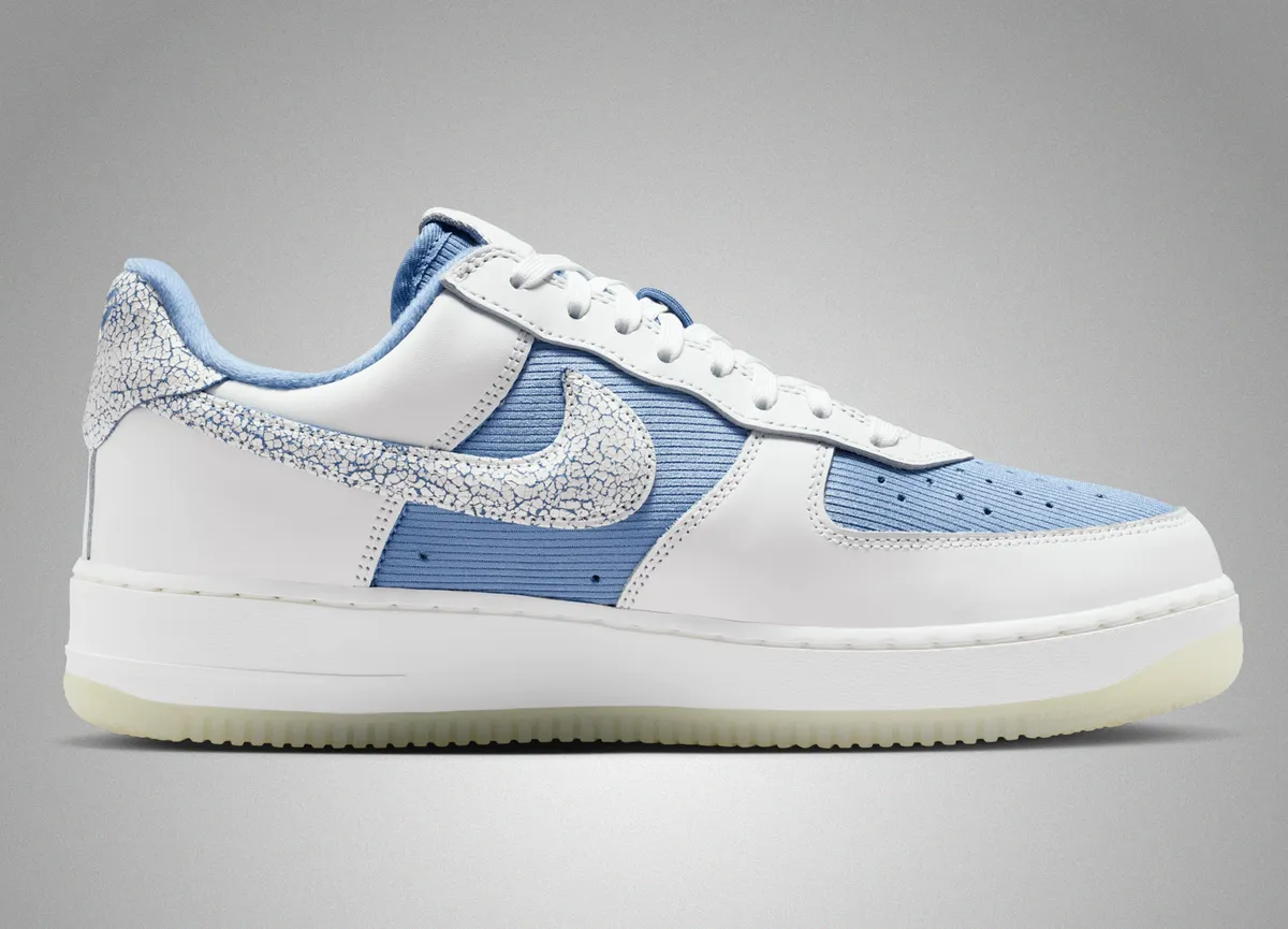 アッパーの大部分は清潔感のあるサミットホワイトのスムースレザーと温かみのあるワークブルーのコーデュロイ生地で構成されています。特に目を引くのはつま先からサイドにかけて配されたコーデュロイの質感です。