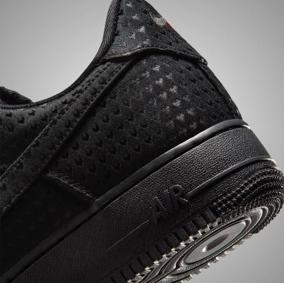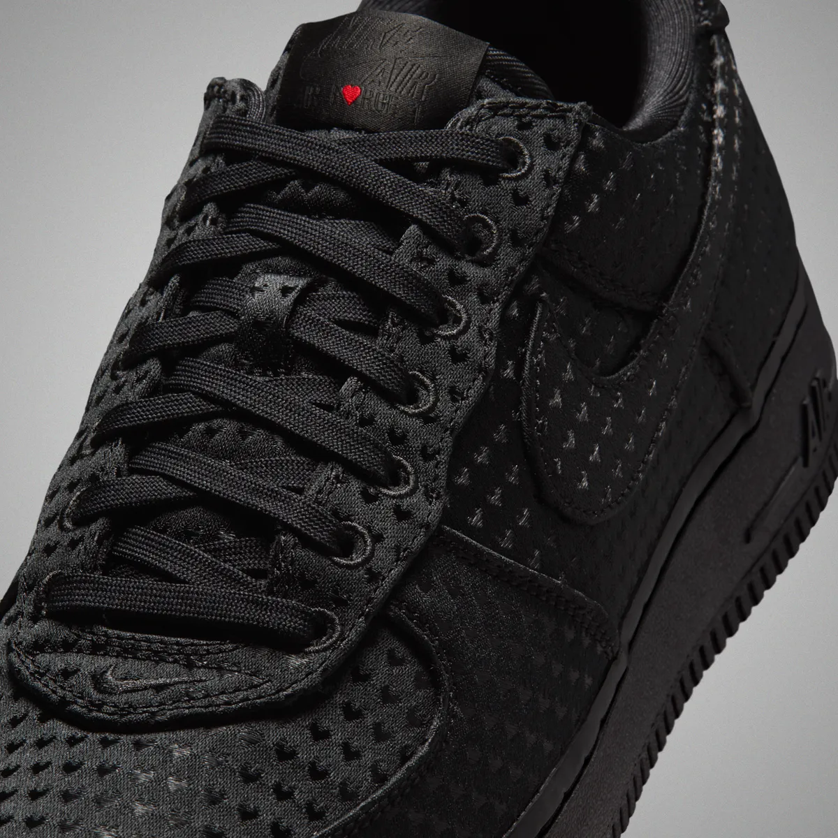 アッパーの素材感は滑らかでありながらもしっかりとした厚みを感じさせスウッシュロゴや補強パーツも同色の黒で統一されています。この徹底したカラーリングの追求によりジャカードの複雑な文様が際立つ構造となっています。その静かな黒の世界の中でタンパッチとヒール部分に刺繍されたユニバーシティレッドの小さなハートマークが強烈なアクセントとして輝きます。この小さな赤の点景が全体の印象をただの黒い靴から特別な日のための物語を持つ一足へと昇華させています。さらにソールから靴紐に至るまで黒でまとめられたシルエットがその赤いハートの存在をより鮮明に引き立てています。
