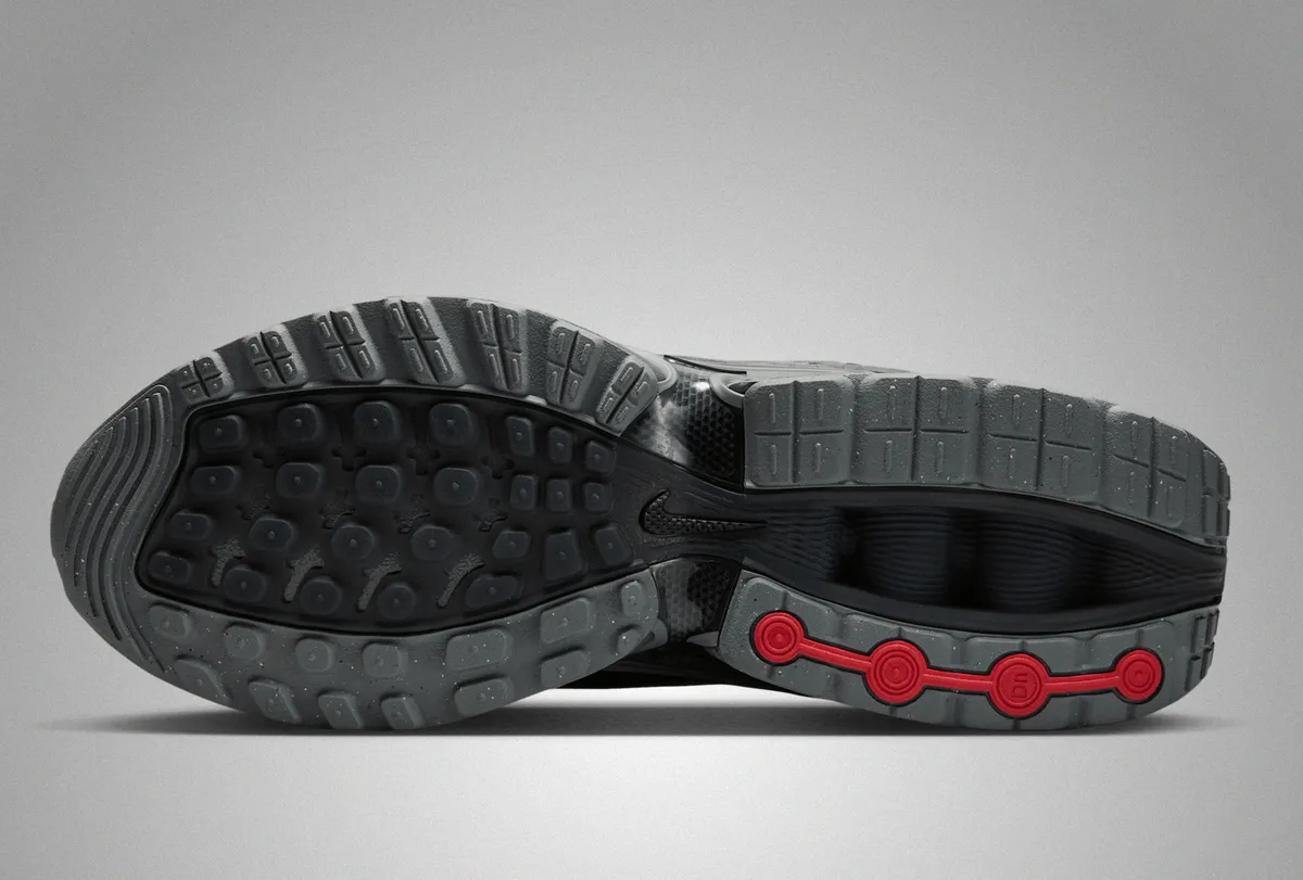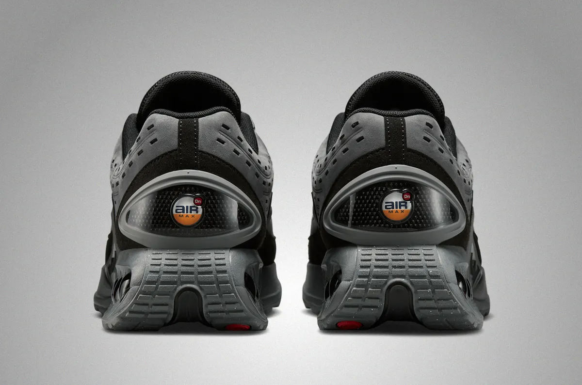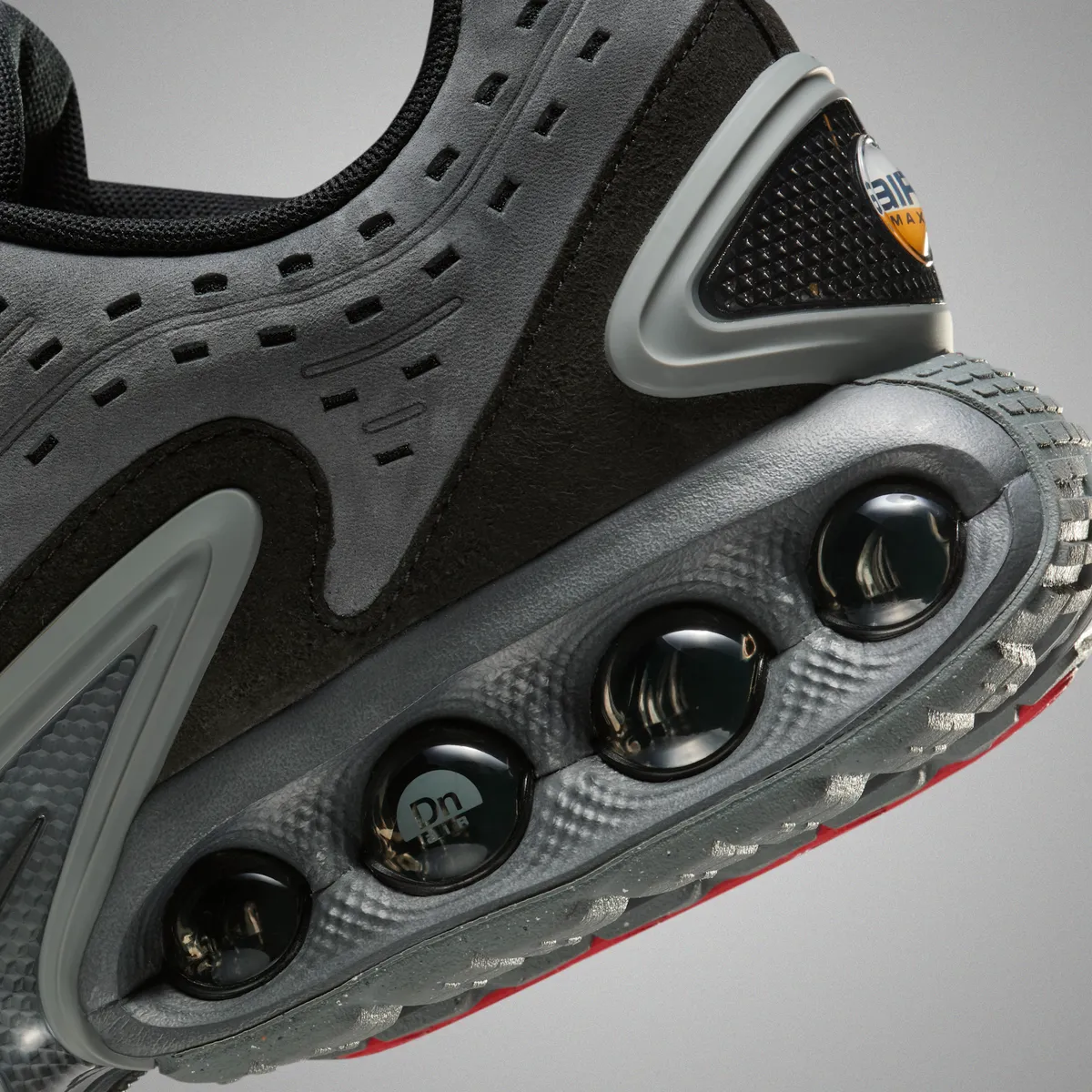 足元を支えるソールユニットには円筒状の形状が目を引くダイナミック エアが搭載されています。この透明感のあるパーツは背面のブラックの樹脂素材と重なり合うことで重厚感の中にハイテクな印象を添えています。アウトソールは堅牢なラバー素材で覆われ接地面には複雑なパターンが刻まれています。かかと部分に配置された赤いポイントマークが無機質な配色の中での唯一のアクセントとなり視線を惹きつける要素として機能しています。
