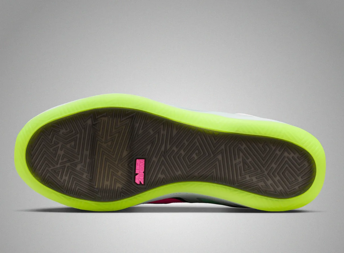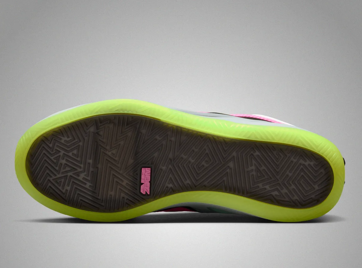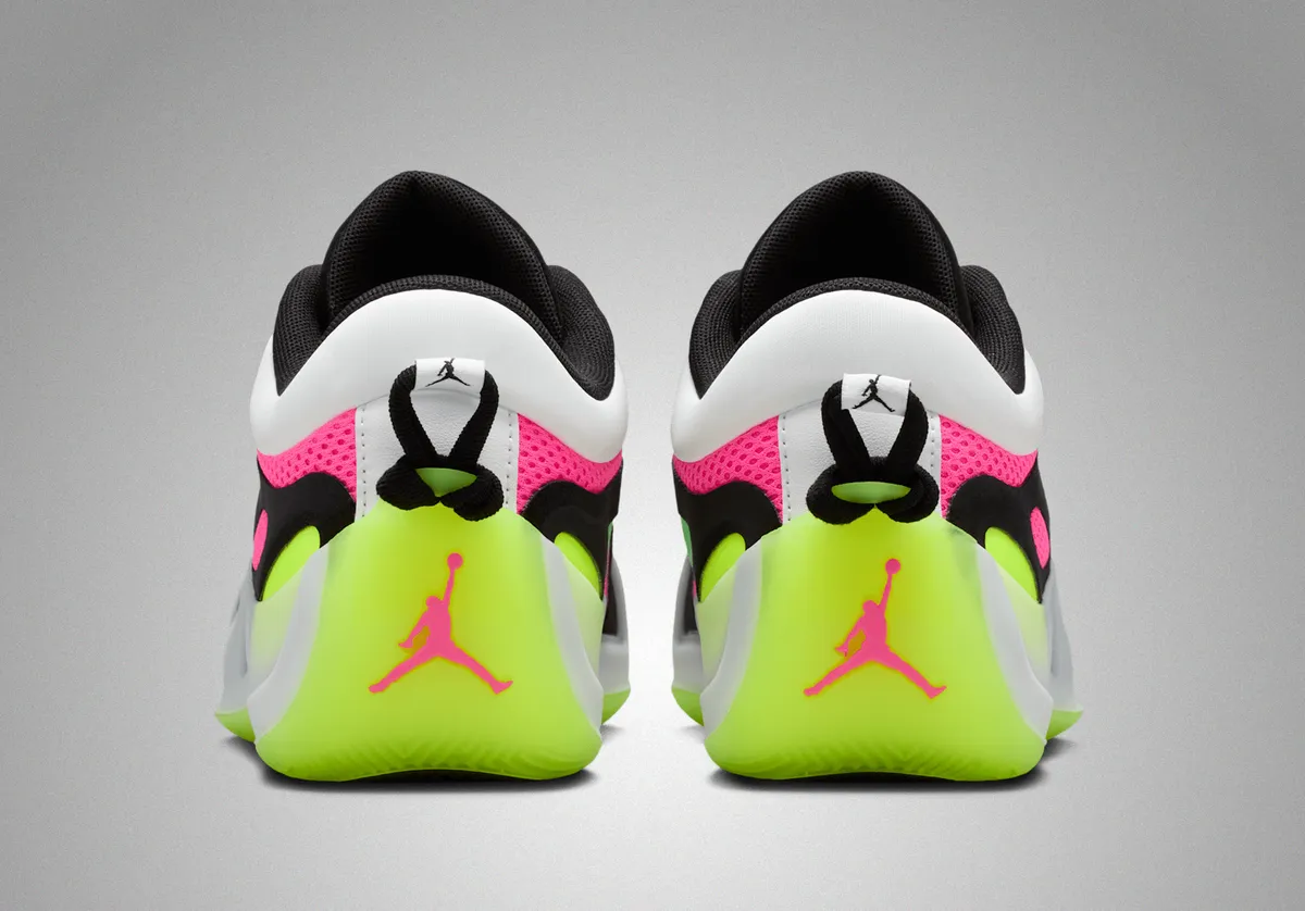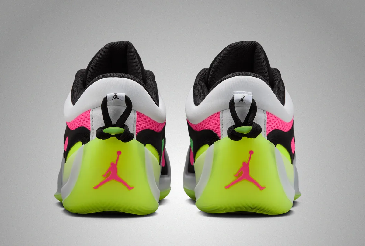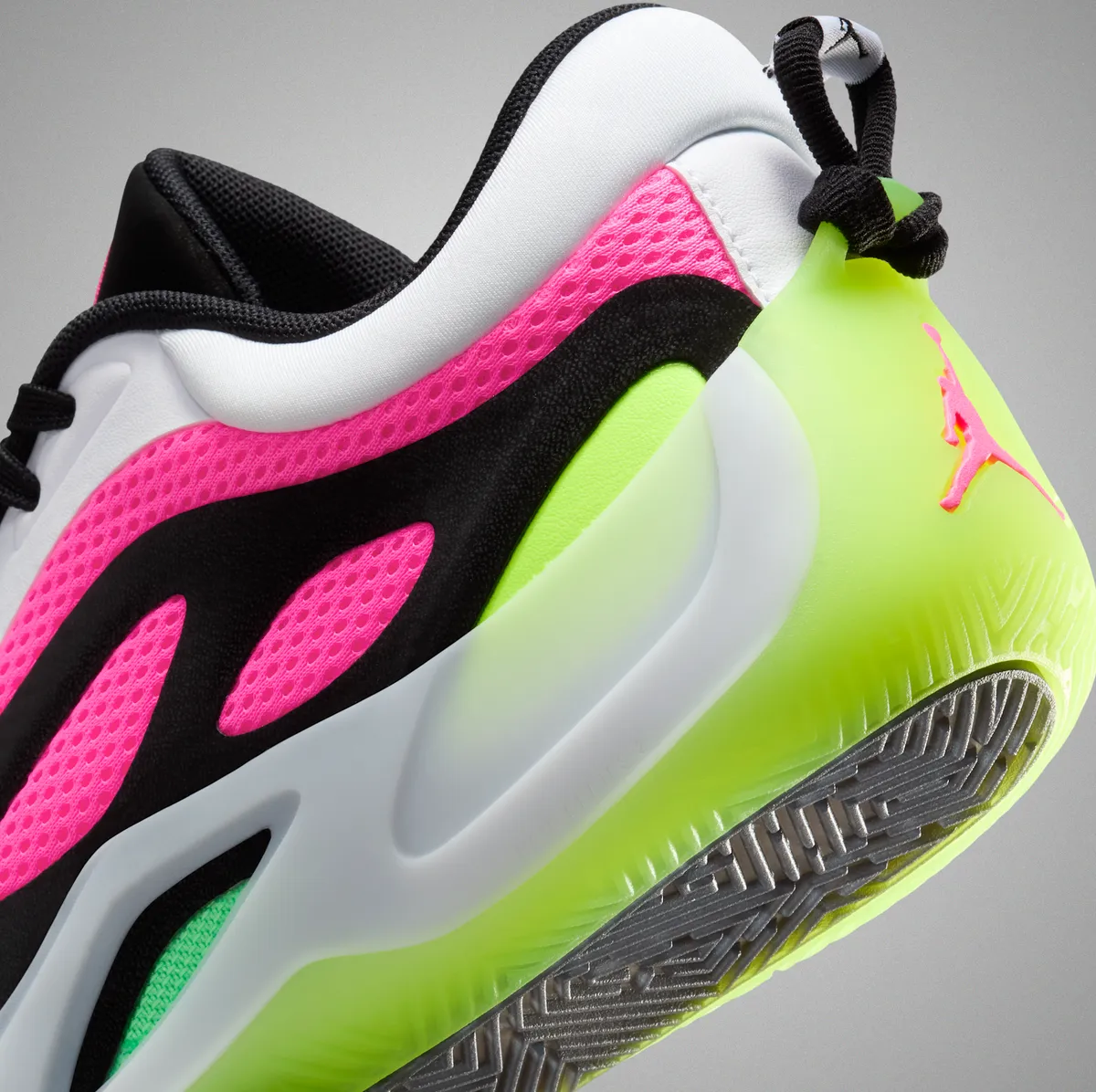 足元を支えるソールユニットは半透明のライトルシッドグリーンが採用されており氷のような清涼感とネオンカラーの力強さを併せ持っています。ミッドソールの側面には波打つような曲線が彫り込まれ静止した状態でも躍動感を感じさせるシルエットに仕上げられました。アウトソールに目を向けると複雑なヘリンボーンパターンが刻まれており高いグリップ力を予感させる緻密な造形が確認できます。かかと部分に配置されたピンクのジャンプマンロゴは透明感のある素材越しに浮かび上がりデザインのアクセントとして機能しています。