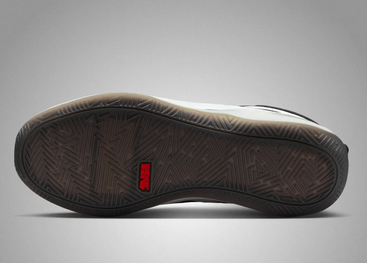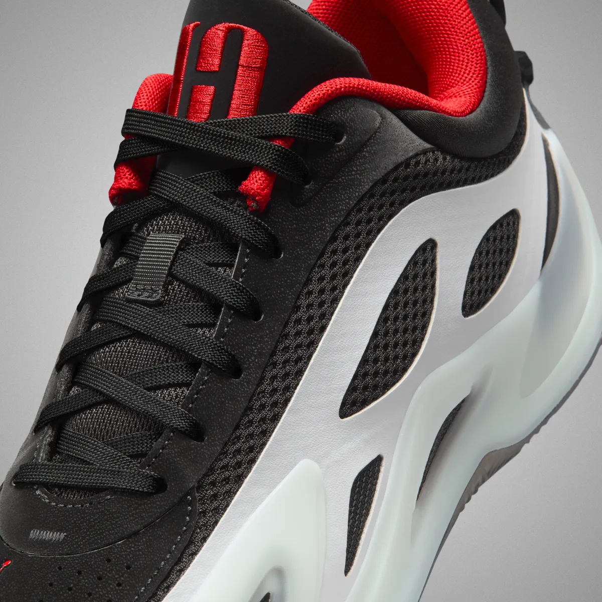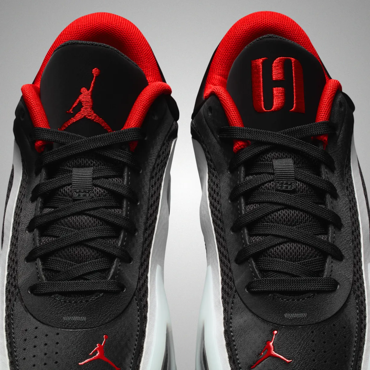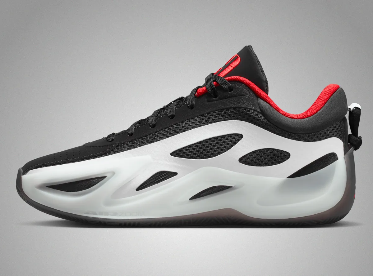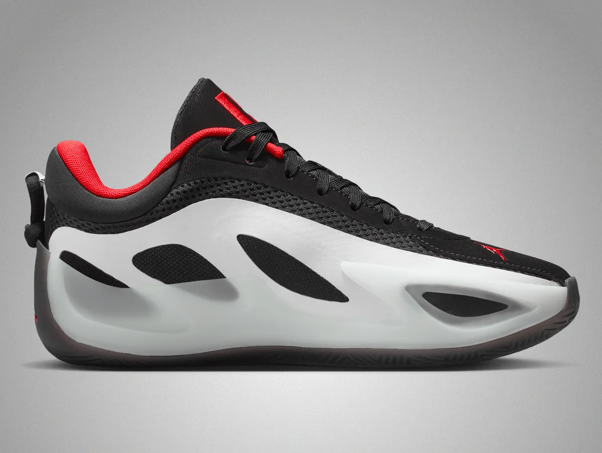 履き口の内側やシュータンのロゴそして背面のジャンプマンマークには燃えるようなユニバーシティレッドが配置されました。この赤は単なる差し色に留まらず黒と白の世界観にエネルギッシュな息吹を吹き込んでいます。細部を確認すると精緻なステッチワークが各パーツの境界線を強調しプロダクトとしての完成度の高さを物語っています。