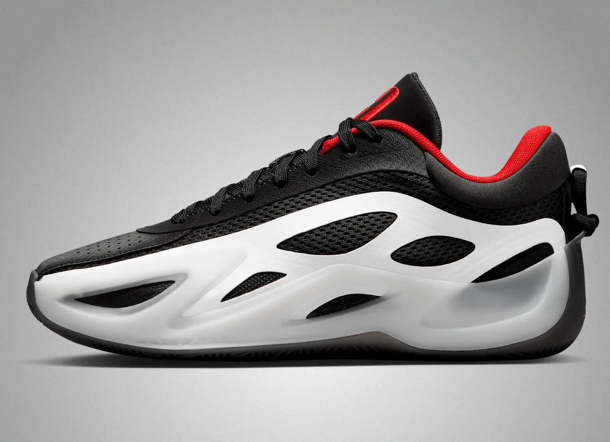 まず目を引くのは漆黒のアッパーと鮮烈な赤そして清潔感のある白が織りなす見事なコントラストです。メイン素材にはマットな質感のブラックレザーと通気性に優れたメッシュが組み合わされており異素材が重なることで立体的な奥行きが生まれています。側面を覆うホワイトの外付けケージは波打つような曲線を描きながら足元を包み込み視覚的なアクセントと高い安定感を両立させています。この白いパーツには滑らかな光沢があり周囲の黒いメッシュ部分との明暗差がスニーカー全体の輪郭をよりシャープに際立たせています。