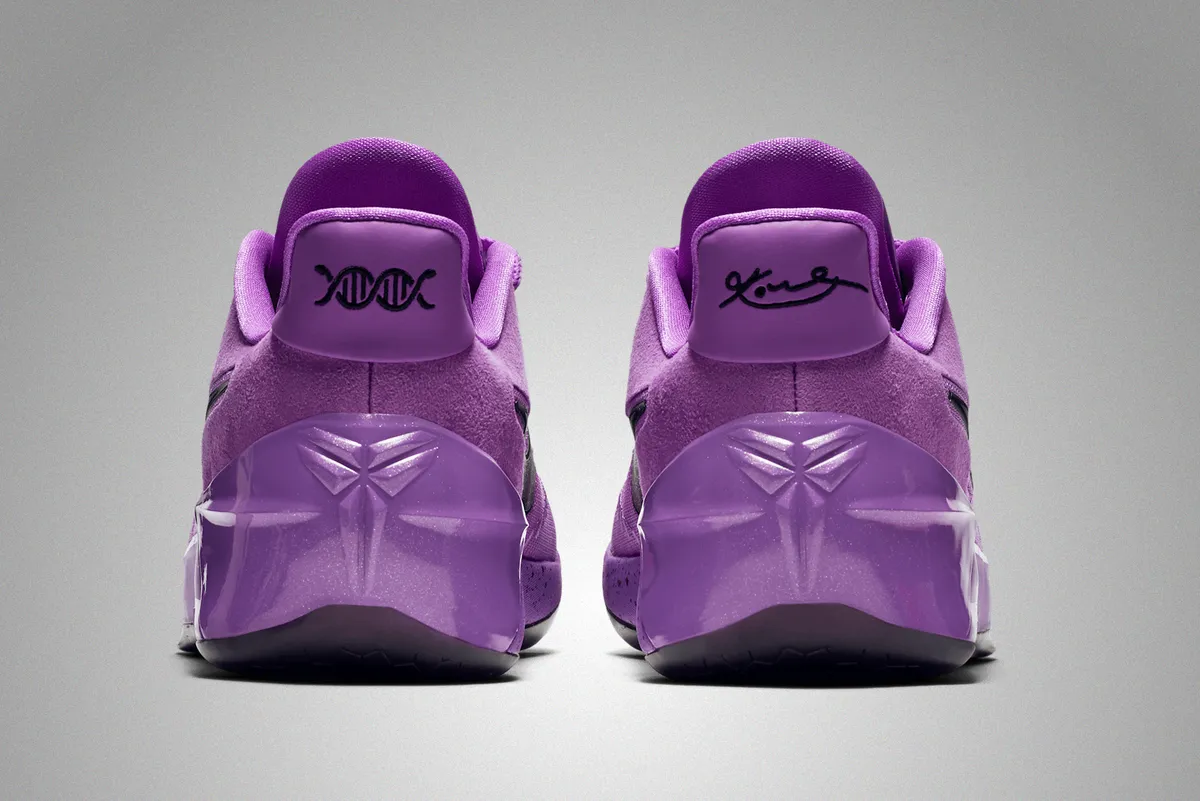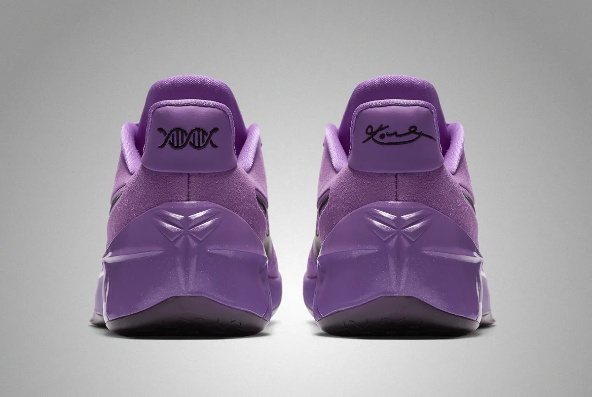 足首周りのカットは低めに設定されており流れるようなローカットのラインが足元に軽快な印象を与えます。かかと部分のパーツは面を強調した多角的な形状が特徴で構造的な力強さを演出しています。さらに左右のヒール部分にはそれぞれ異なる意匠が施されています。左足にはコービー・ブライアントの象徴的なロゴが刻まれ右足には彼の背番号や氏名を想起させる特別なグラフィックが配置されており細部にまでこだわりが詰まっています。