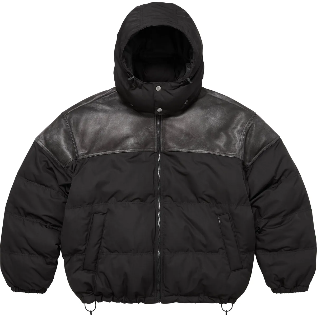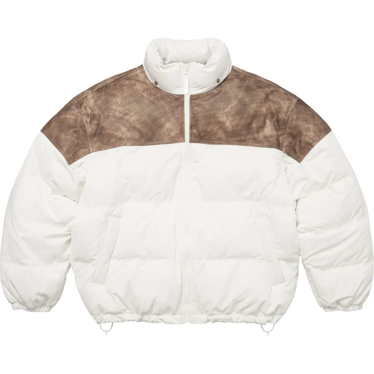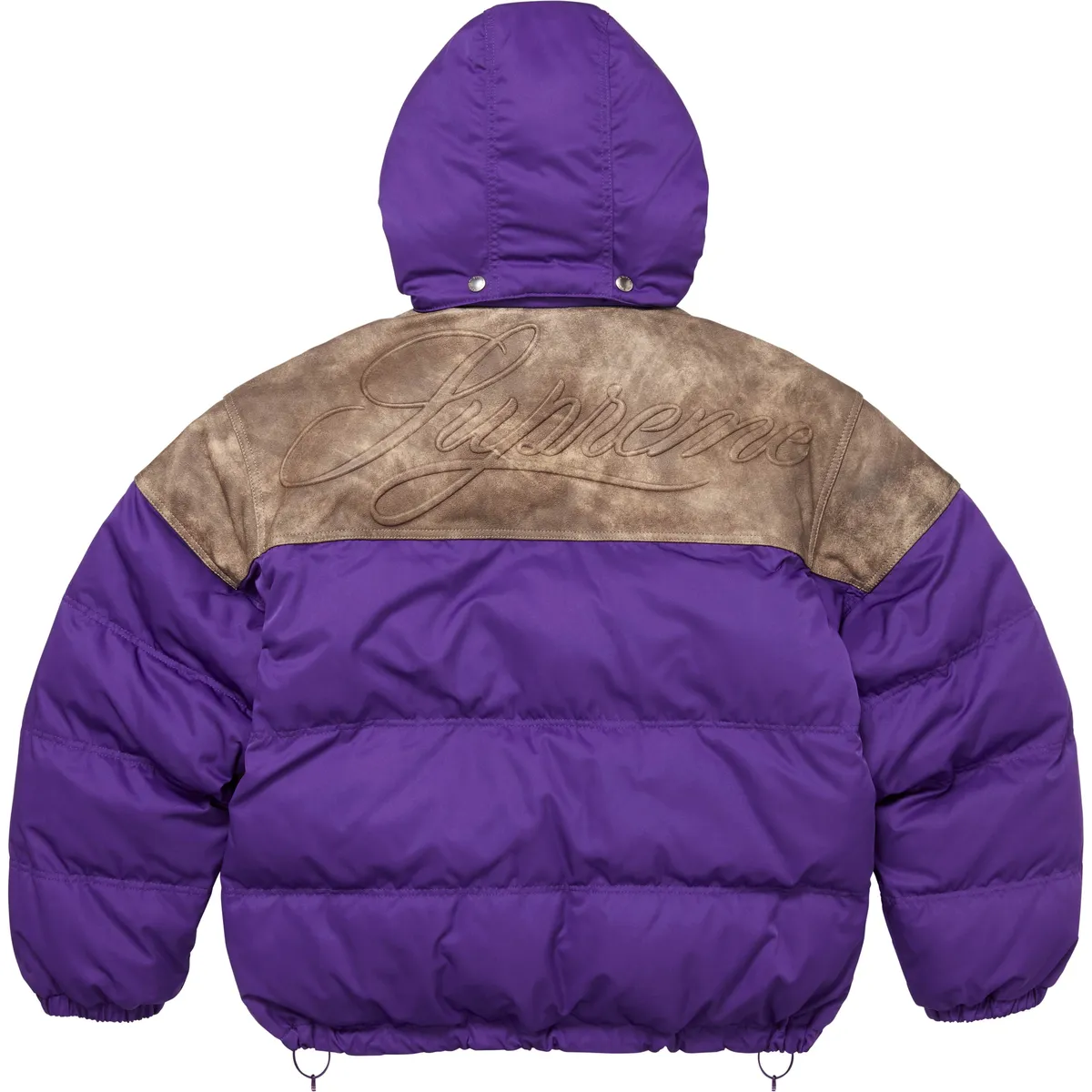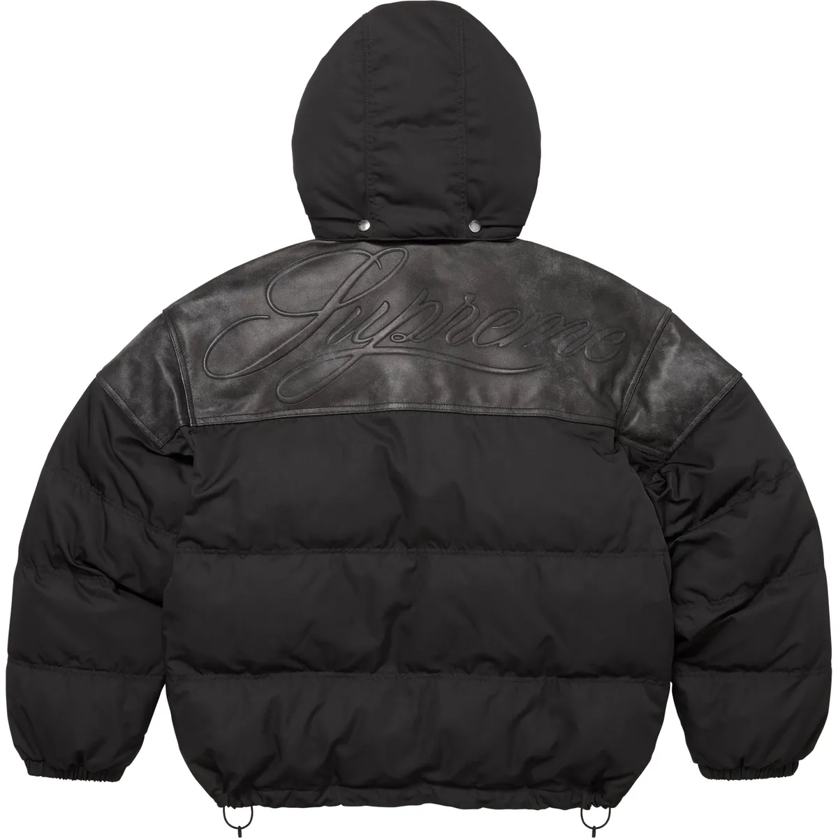 耐水性のあるポリエステル素材にラムスキンレザー(子羊革)のヨークを組み合わせ、Primaloft(プリマロフト)断熱材入りのキルティング構造とタフタ裏地を採用。フロントはフルジップ仕様で、前面下部にスナップ付きウェルトハンドポケット、袖にはジップ付きスタッシュポケットを装備。内側にはジップポケットとベルクロ式ポーチポケットを備え、取り外し可能なフードと裾には伸縮性ショックコードを内蔵。袖口はゴム仕様。背面ヨークにはエンボス加工のロゴ入り