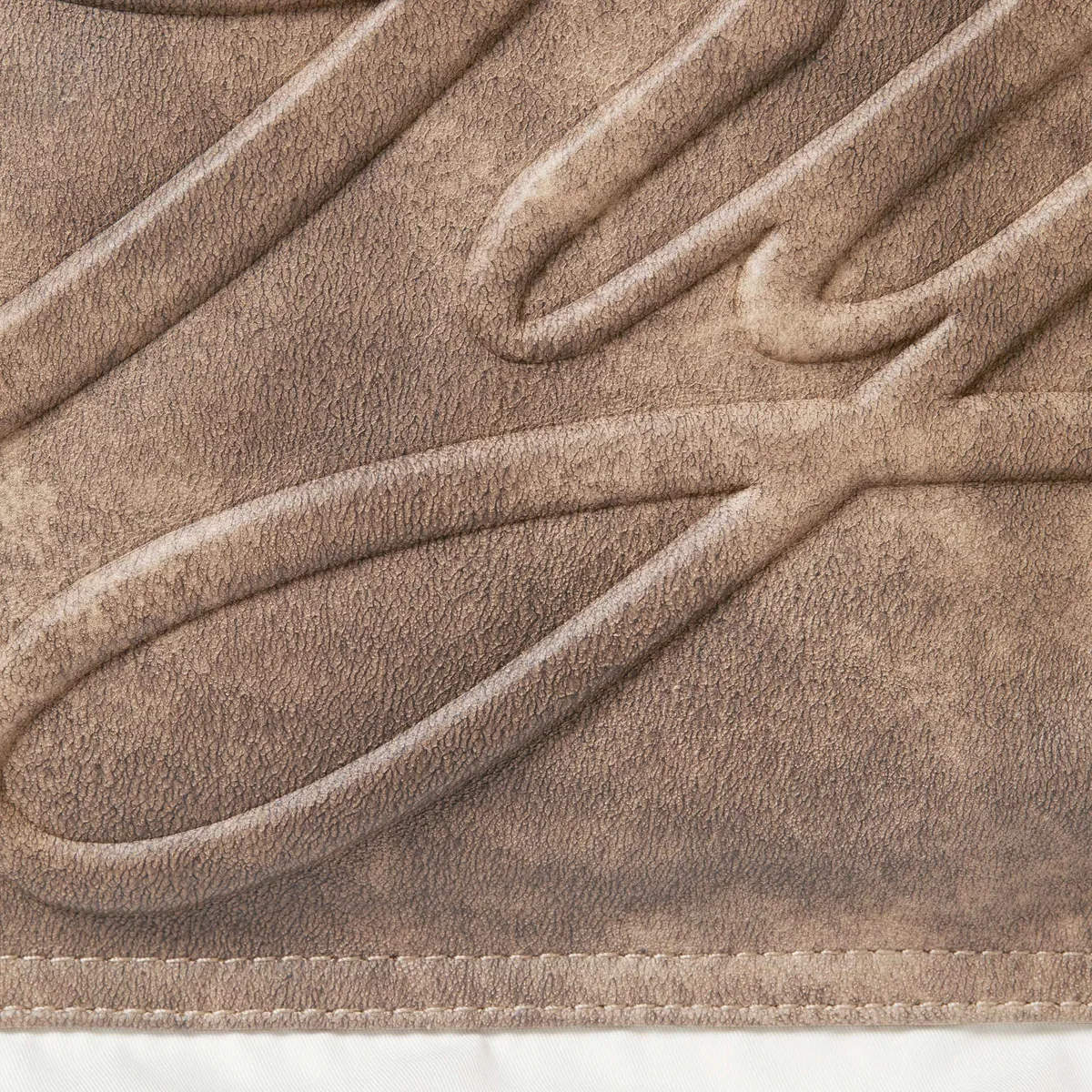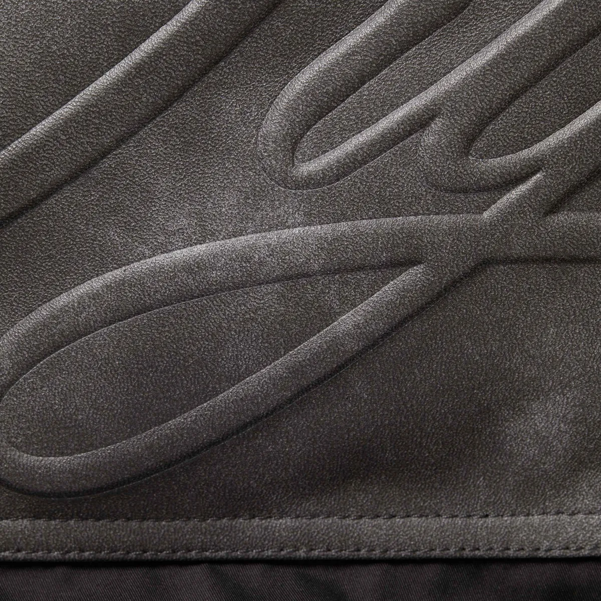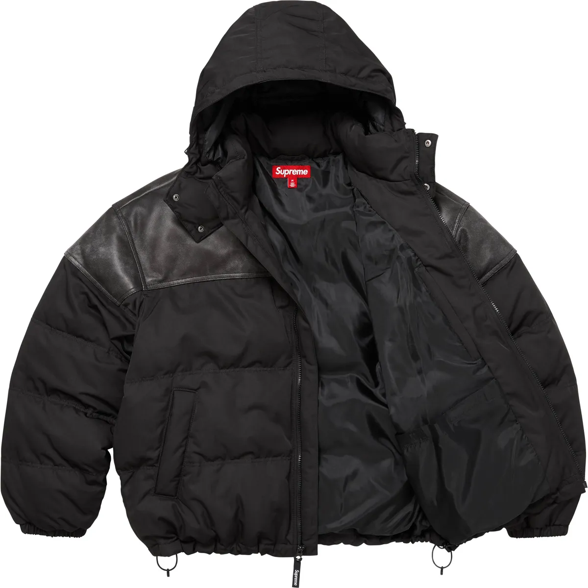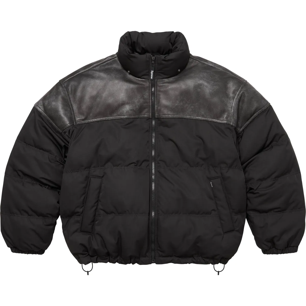 耐水性のあるポリエステル素材にラムスキンレザー(子羊革)のヨークを組み合わせ、Primaloft(プリマロフト)断熱材入りのキルティング構造とタフタ裏地を採用。フロントはフルジップ仕様で、前面下部にスナップ付きウェルトハンドポケット、袖にはジップ付きスタッシュポケットを装備。内側にはジップポケットとベルクロ式ポーチポケットを備え、取り外し可能なフードと裾には伸縮性ショックコードを内蔵。袖口はゴム仕様。背面ヨークにはエンボス加工のロゴ入り