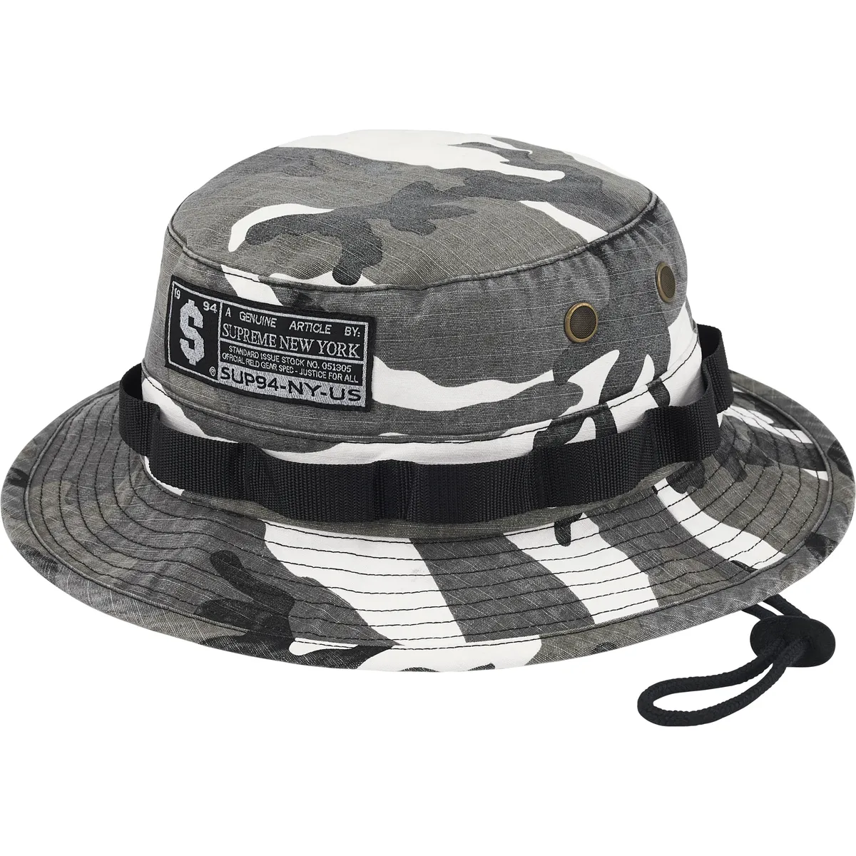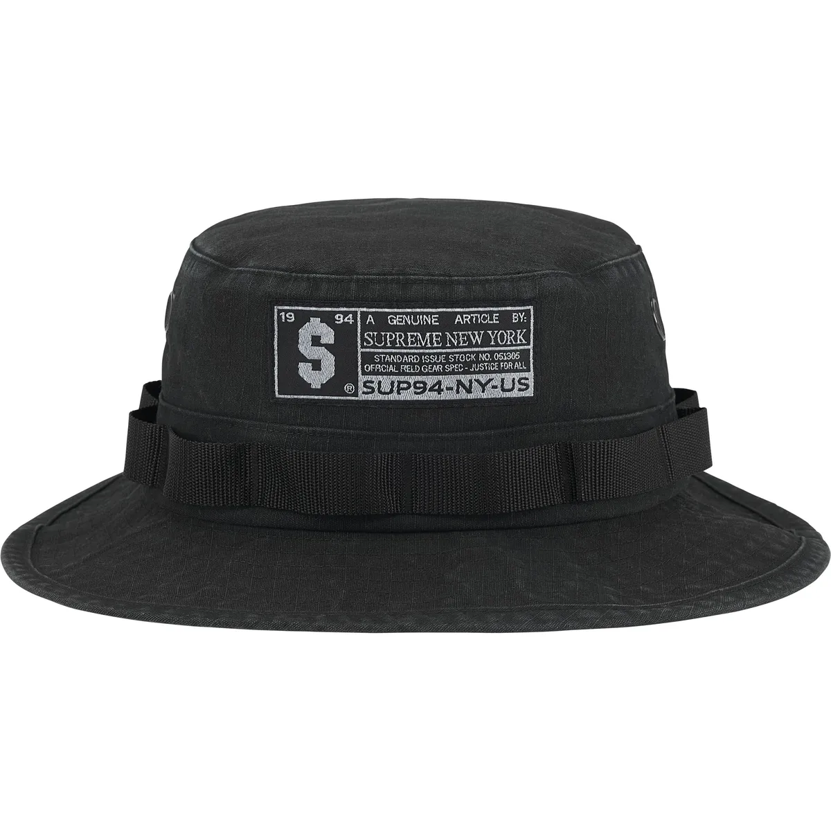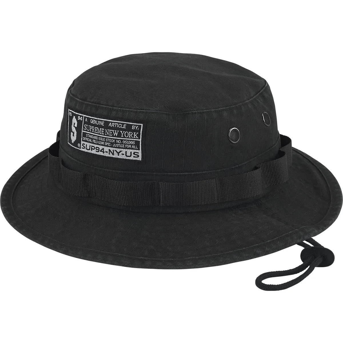 綿100%リップストップ素材のブーニーハット。綿コード留め具と革製コードストッパー付き。前面に反射性織りロゴラベル