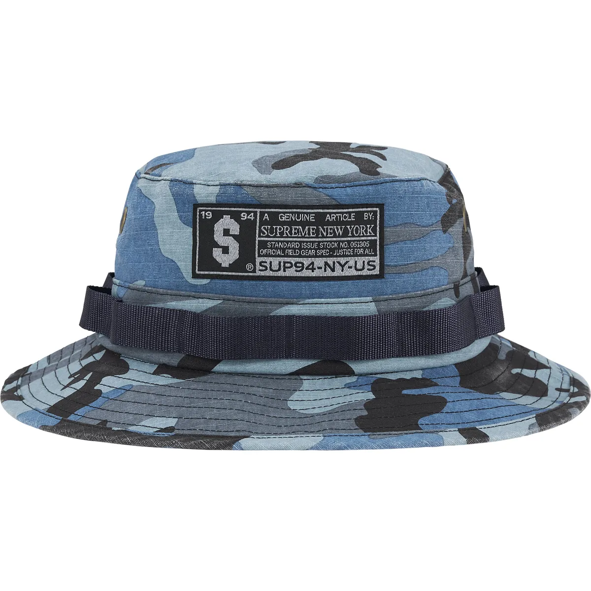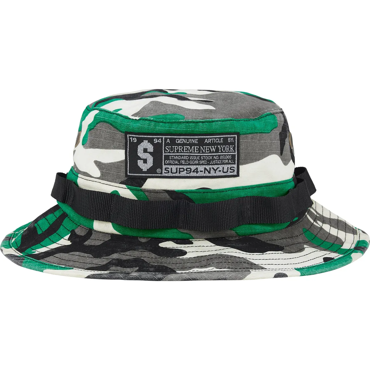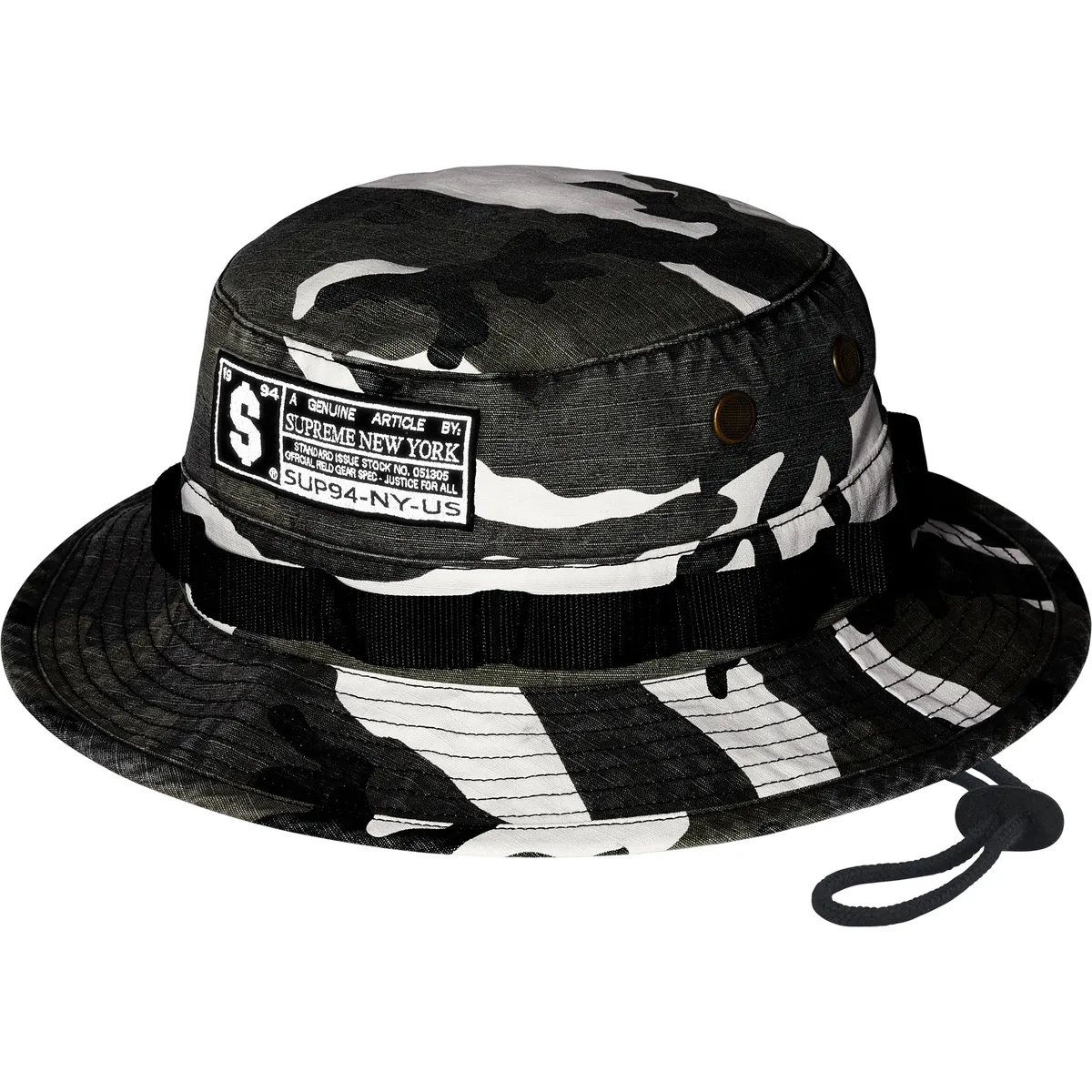 綿100%リップストップ素材のブーニーハット。綿コード留め具と革製コードストッパー付き。前面に反射性織りロゴラベル