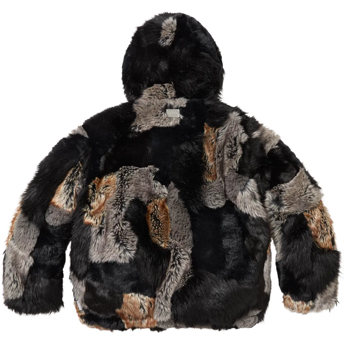 パッチワーク柄のフェイクファー、GORE WINDSTOPPER ドロップライナー、ジャカードロゴ入りビスコース裏地。フルジップ開閉式で、前面下部にウェルトハンドポケット、内側に胸ポケット付き。袖口と裾はゴム仕様。後首元にメタルロゴプレート